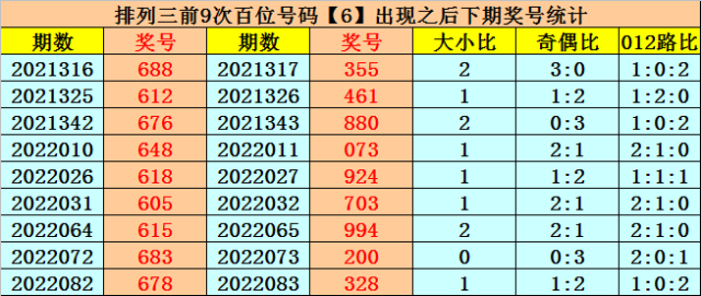 在百位前9次出现号码6之后,下期百位分别开出奖号:3-4-8-0-9-7-9-2-3,其中开出号码个数奇偶比是5:4,大小比是4:5,012路比是5:2:2。