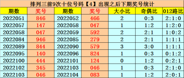 在十位前9次出现号码4后,其下期奖号分别开出:6-4-9-7-7-2-2-4-8,其中奖号个数012路比是2:4:3,奇偶比是3:6,大小比是5:4。
