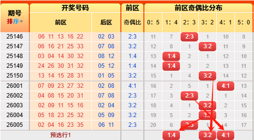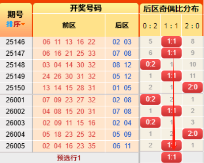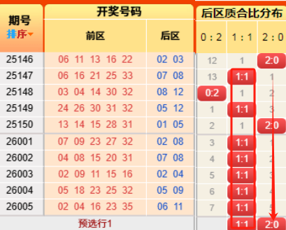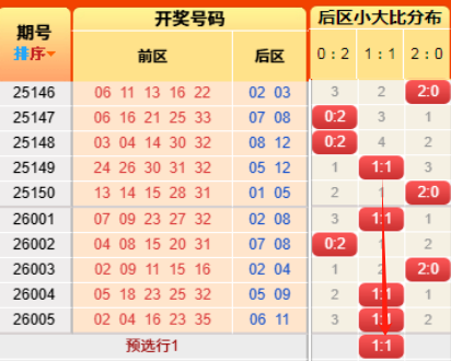 上期前区小大比3:2,新的一年新的总计5期中5期。言归正传我们继续用历史数据说话,前区小大比分成6种0:5、1:4、2:3、3:2、4:1、5:0(如图),我统计了一下历史出现次数,0:5出现107次、1:4出现515次、2:3出现978次、3:2出现814次、4:1出现355次,5:0出现54次,再看近10期小大比出现次数比为1:1:2:4:1:1,通过历史数据对比观察以及根据遗漏对称理论原则,故本期我们选择2:3、3:2、4:1;(具体精准方向请查看小车小大比精选)