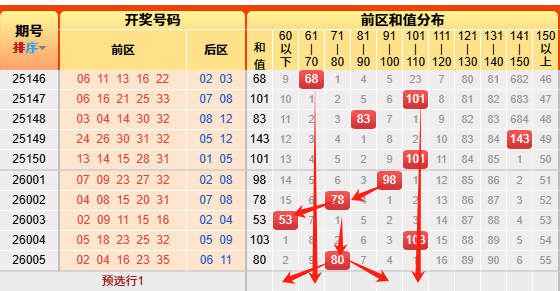 上期开出和值80,我推测81推测命中和值之差一点点,本次我们先根据历史次数统计,和值60以下开出250次、61-70开出237次、71-80开出373次,81-90开出488次、91-100开出498次,101-110开出383次、111-120开出313次、121-130开出155次、131-140开出90次、141-150开出27次、150以上开出9次,再来看近十次以上和值分别开出了1次、1次、2次、1次、1次、3次、0次、0次、0次、1次、0次 ,低于阈值的有60区间以下、61-70区间、81-90区间、91-100区间、101-110区间、121-130区间,再根据遗漏斜率对称理论,本期注意91-100区间、61-70区间、60以下区间、101-110区间。