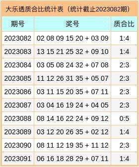 后区质合分析:上期后区开出质、质数号码07、11,后区最近30期质合比为35:25,最近20期质合比为23:17,最近10期质合比为11:9,最近5期质合比为5:5,本期看好后区开出【质质】数号码,后区参考:03、05。