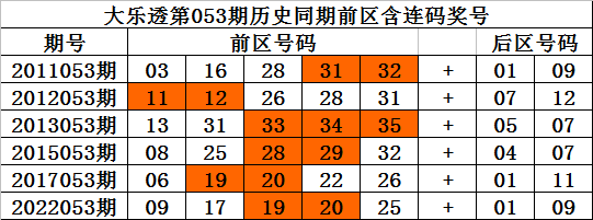 9。在历史同期奖号中,后区号码01 03 07 11出现4次;05 06 09 12出现3次;04出现2次;02 10出现1次;08历史同期没有出现。