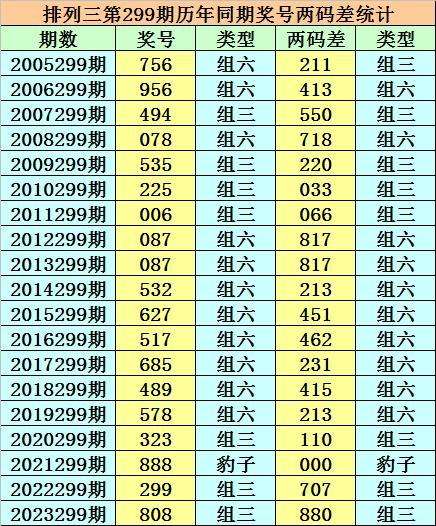 在排列三第299期历史同期开奖中,各号码两码差分别为:112、134、055、178、022、033、066、178、178、123、145、246、123、145、123、011、000、077、088;
