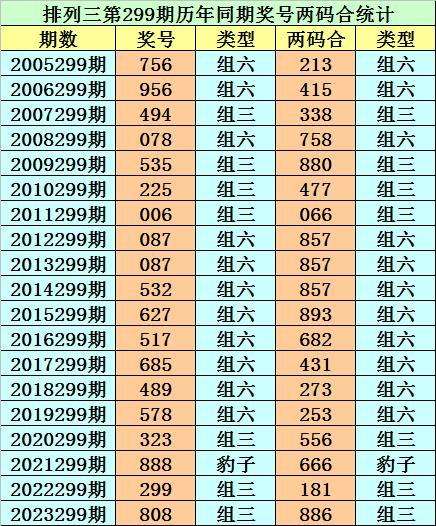 排列三从2004年开奖至今已开出7070期奖号了,其中第299期历史同期奖号出现19次,历年第299期分别开出号码:756、956、494、078、535、225、006、087、087、532、627、517、685、489、578、323、888、299、808。