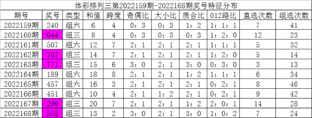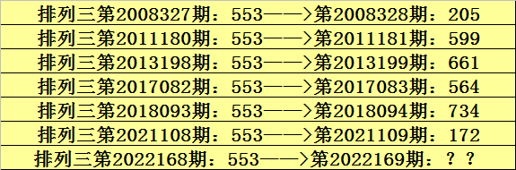 第2022168期排列三奖号为553,历史上该号码直选出现7次,下期奖号分别为:205、599、661、564、734、172。