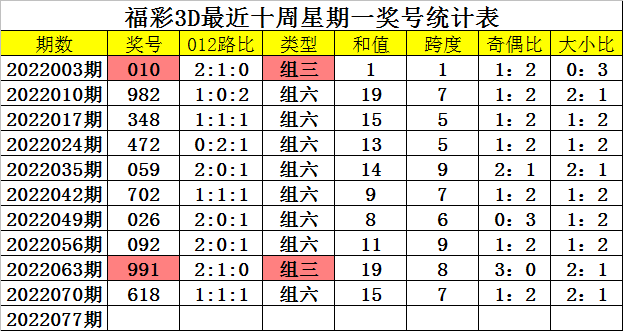 则,3D第2020313期开出奖号:538,其大小比为2:1,奇偶比为2:1,012路比为1:0:2,与3D第2022077期奖号可能没有同号。