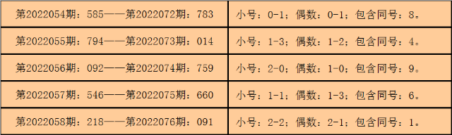 所以,3D第2022059期开出奖号:727,其大小比为2:1,奇偶比为2:1,012路比为0:2:1,与3D第2022077期奖号可能有同号。