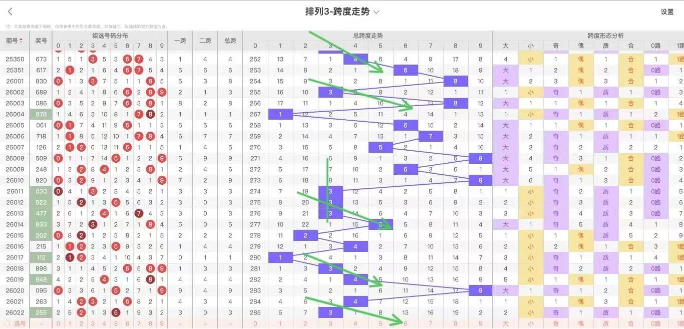 10期内跨度走势为:3-5-2-4-1-3-4-9-4-3,10期内大小跨比为2:8,奇偶跨比6:4,百期内跨度3共开出17次,下期数据:4 5 3 5 9 5 7 1 7 6 4 8 3 3 5 4近期度较热,考虑跨度3开出后容易出大跨度,近期大小规律下大:奇:质,所以接下来继续大跨,奇跨度表现!