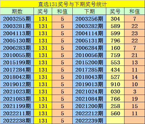 第2022238期3D奖号为:131,历史上该号码直选开出15次,下期号码分别为:304、589、599、796、160、759、553、434、527、910、030、766、258、560。
