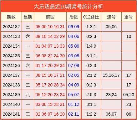上期回顾:大乐透2024141期开出奖号:前区02、06、07、16、20,后区02、11。