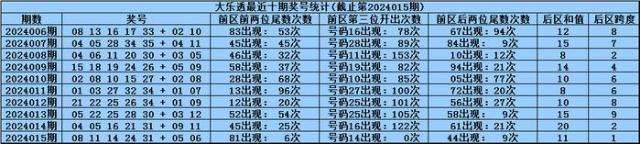 体彩大乐透第2024015期奖号为:08 11 14 24 31+05 06,前区号码大小比开出2:3,012路比开出1:1:3,奇偶比开出2:3,后区号码和值开出11,跨度开出1。