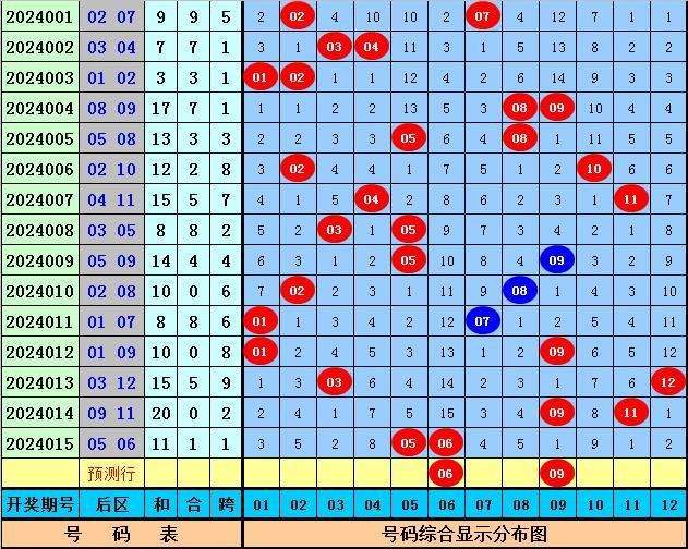 后区奖号分析:上期后区开出奖号05+06,奖号和值为11,跨度为1,本期后区注意和值走大,参考两码06 09。