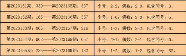 则,3D第2023083期开出奖号:870,其大小比为2:1,奇偶比为1:2,012路比为1:1:1,与3D第2023170期奖号可能没有同号。