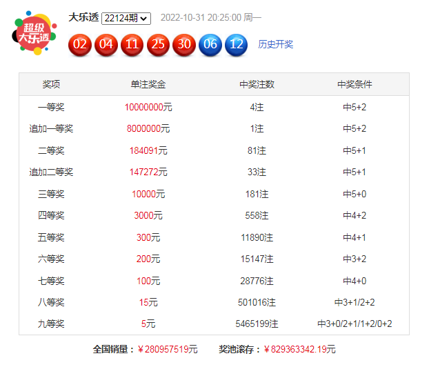大乐透第2022124期奖号为:02、04、11、25、30+06 12,其中前区奇偶比为2:3,大小比为2:3,和值为72,后区和值为18,跨度为6。