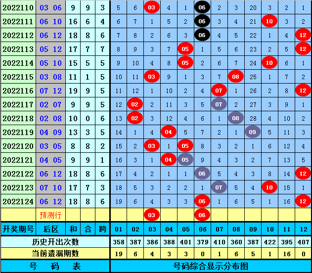 后区分析:上期后区奖号为06和12,最近5期后区和值分别为8、9、18、17、18,后区跨度分布范围在1-6,本期后区注意两码03、06。