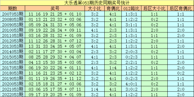 后区判断:后区第053期历史同期奖号大小比总比例为15:17,大号出现较少,本期看好大号回补,注意开出一大一小组合,两码参考02、08。