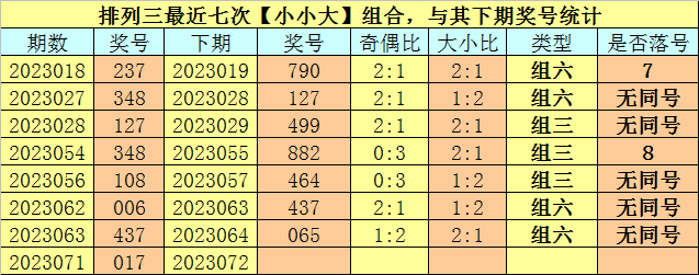 大小分析:排列三上期开出号码017,大小类型为【小小大】,最近七次开出大小类型小小大的奖号分别为:237、348、127、348、108、006、437,其下期分别开出号码:790、127、499、882、464、437、065。其中号码大小比为11:10,大小号码出现次数基本相当,本期注意大号转热,看好出现2个大号。