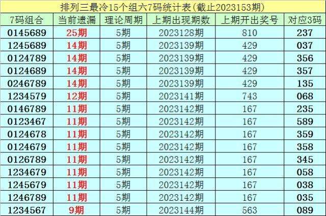 (1)在排列三已开出的6574期奖号中(统计截止第2023153期),目前7码组六遗漏值最大的组合为:0145689,本期遗漏25期;