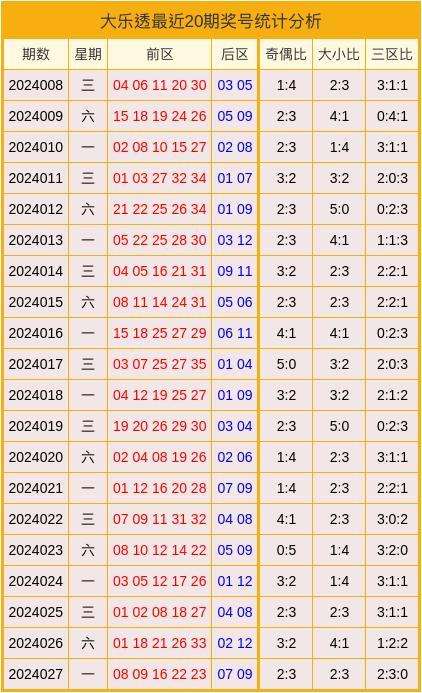 奇偶分析:近20期前区奖号中,奇偶比为47:53,偶数开出较多。上期前区奖号中,奇偶比为2:3,偶数开出较多。本期预计奇偶比为3:2。