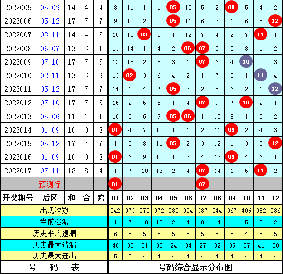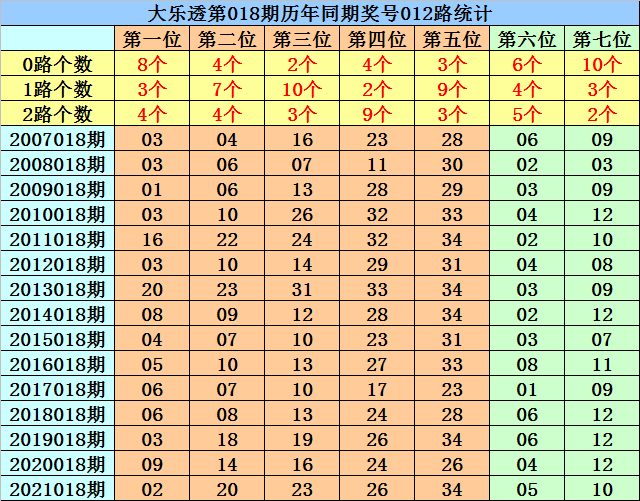 后区第二位分析:在第018期历史同期开奖中,第二位号码分布在03-12之间,号码012路比为10:3:2,其中0路号码:12出现5次,09出现4次,03出现1次;1路号码:10出现2次,07出现1次;2路号码:08、11出现1次,目前2路号码遗漏5年,今年同期排除2路号码,参考1路号码07。