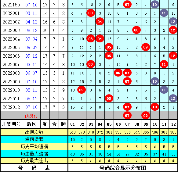后区分析:后区上期开出号码07+10,和值为17,跨度为3。最近10区后一区(01-06)开出8个号码,断区3次,后二区(07-12)开出12个号码,断区1次,本期后一区注意号码:01、03、04;后二区注意号码:07、08、09。