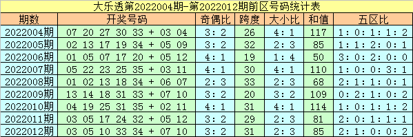 上期开奖:体彩大乐透第22012期开奖号码:03 05 10 33 34+07 10,前区和值:85,跨度:31,奇偶比:3:2,大小比:2:3,五区比:2:1:0:0:2,开出2个重号:03、05。
