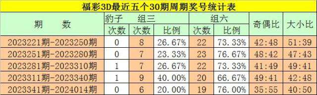 类型分析:福彩3D在上一个30期周期内(第2023311期-第2023340期),组三(含豹子)组合出现了10次,占开奖总数的33%,组六号码出现20期,出现比例为67%,其中组六号码开出比例明显较高。