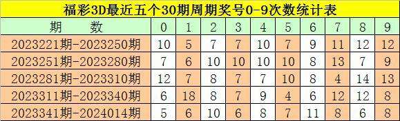 大小分析:在上一个30期周期内(第2023311期-第2023340期),奖号大小比为42:48,小号走势非常热;在但前30期周期内(第2023341期-第2024019期),3D开奖大小比为40:50,小号开出比例明显偏高。小号上期回补,本期注意小号走热,参考大小比1:2。