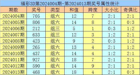 开奖回顾:福彩3D第2024013期开出奖号468。奖号形态为组六,奇偶比为0:3,012路比为1:1:1,大小比为2:1,和值为18,跨度为4。