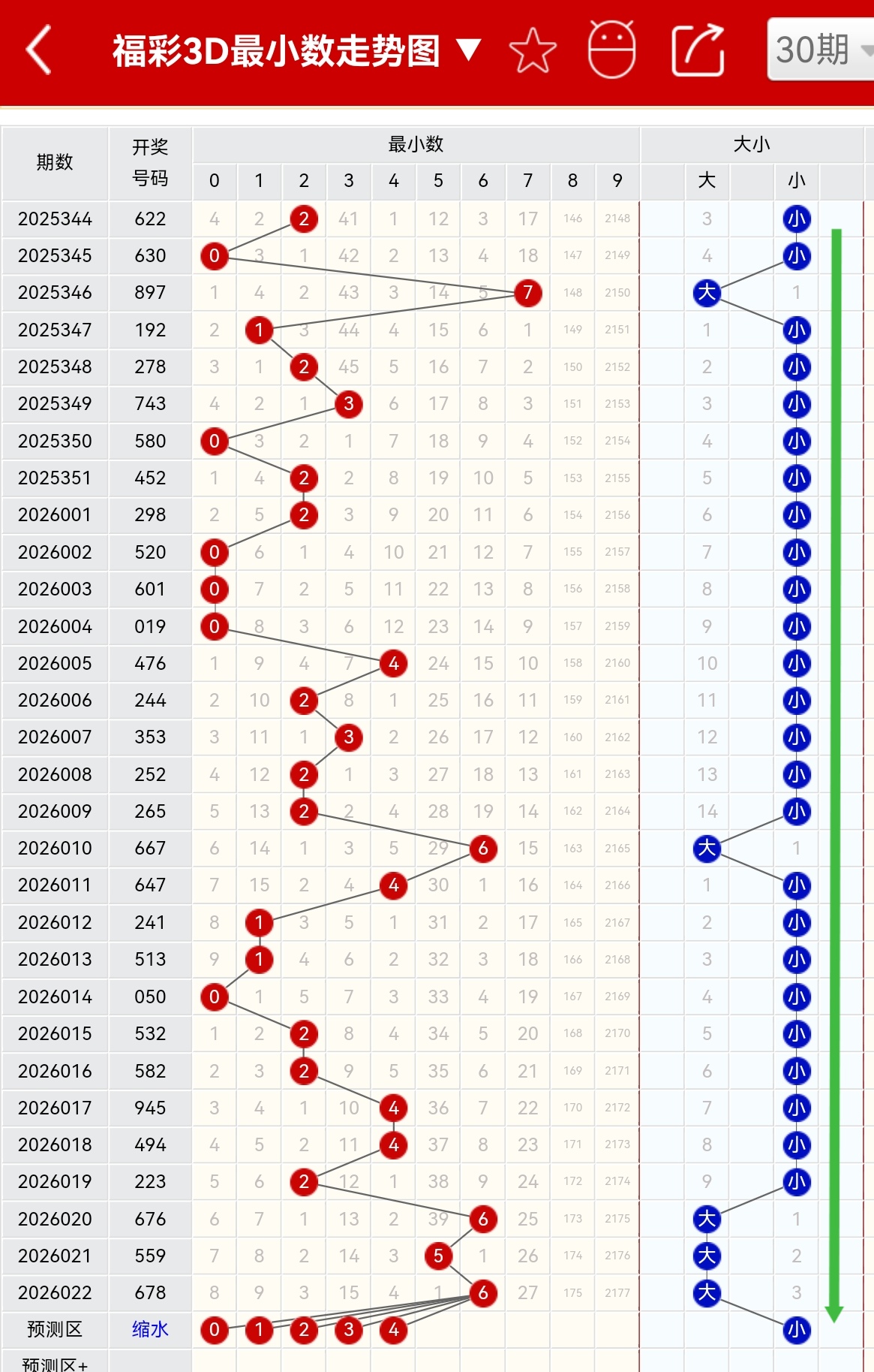1、最小数:022期最小数6,从近30期数据看,在大小走势中,小数当前遗漏了3期,通过对比近400期数据发现,本期小数回补概率增大。所以,本期最小数关注0-4。