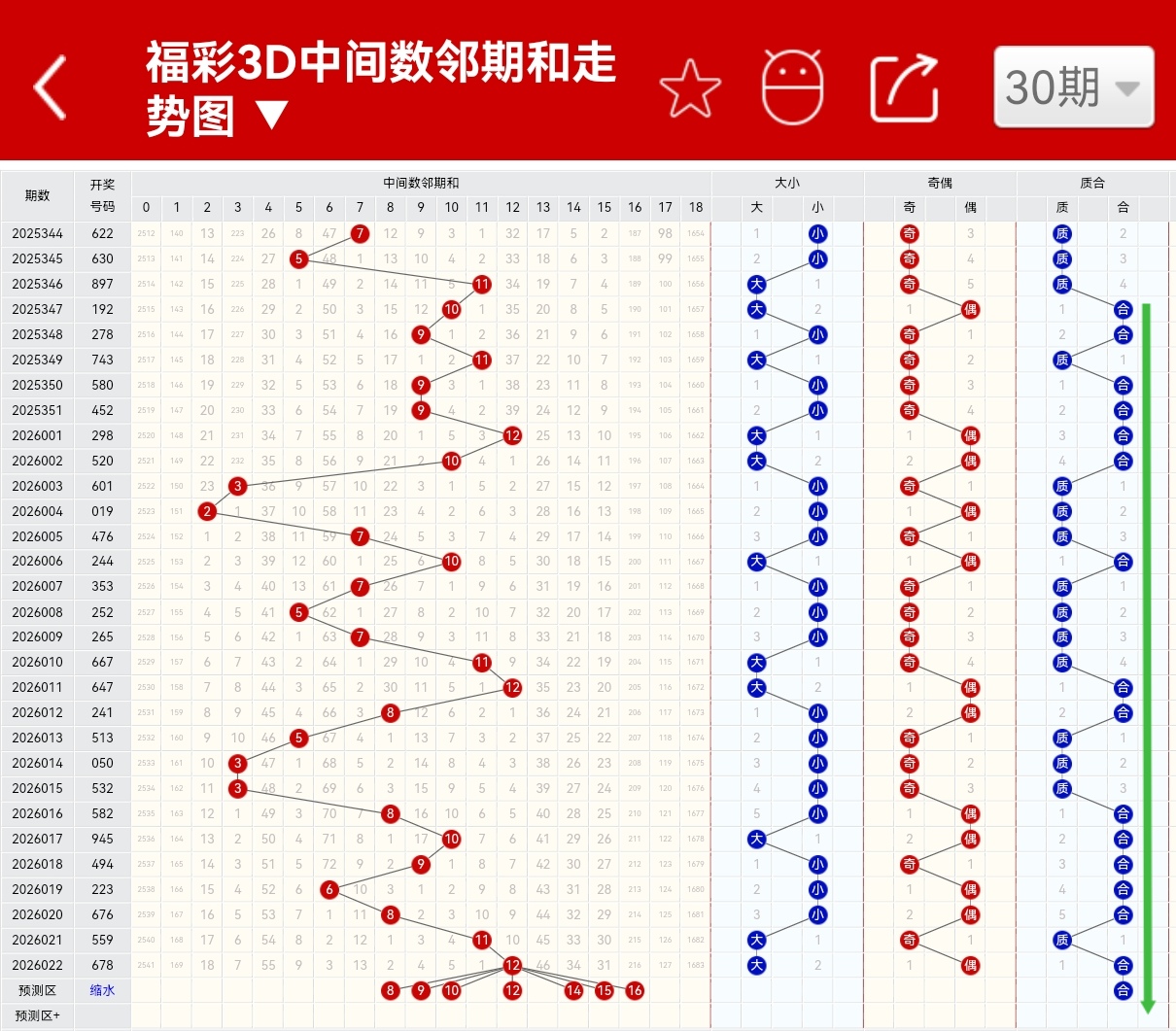 2、中间数:021期中间数5,022期中间数7,邻期和12,从邻期和近30期数据看,在质合走势中,合数当前出现了1期,通过对比近100期数据发现,本期合数连出回补概率增大。所以,结合出号趋势,本期中间数邻期和关注8 9 10 12 14 15 16,计算出中间数关注1235789。
