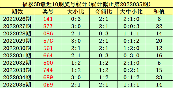 开奖回顾:福彩3D第2022035期奖号为:059。奖号类型为组六,和值为14,奇偶比为2:1,跨度为9,012路比为2:0:1,大小比为2:1。