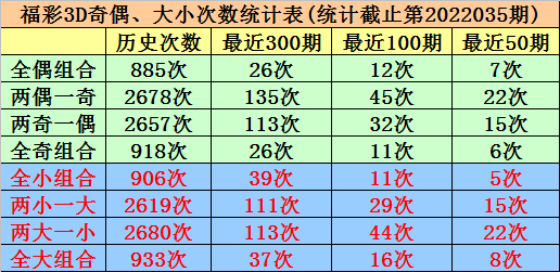 奇偶、大小分析:在最近50期开奖中,全偶组合开出7次,当前遗漏4期、两偶一奇组合开出22次,当前遗漏1期、两奇一偶组合开出15次,当前遗漏0期、全奇组合开出6次,当前遗漏10期,本期注意两偶一奇组合;全大组合出现8期,当前轮空1期、全小组合出现5期,当前轮空9期、两小一大组合出现15期,当前轮空2期、两大一小组合出现22期,当前轮空0期,本期看好开出全小组合。