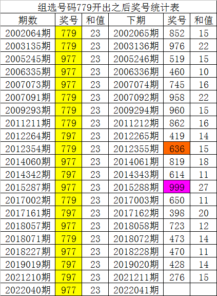 一、上期回顾:福利彩票3D第2022040期开奖结果:奖号为977,奖号和值为:23,奖号跨度为:2。