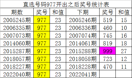 从以上统计可以看出,直选号码977出现之后,其下期奖号:1。下期大号出现概率100%;