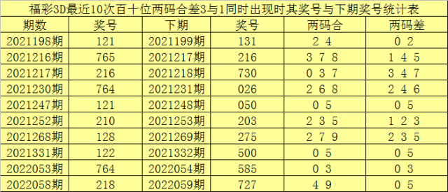 百十位合差分析:上期奖号百十位开出21组合,两码合为3,两码差为1,最近10次百十位两码合3与两码差1同时出现时,其奖号和下期奖号分别为: