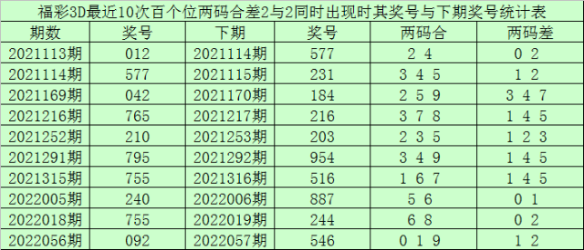 百个位合差分析:上期奖号百个位开出20组合,两码合为2,两码差为2,最近10次百个位两码合2与两码差2同时出现时,其奖号和下期奖号分别为: