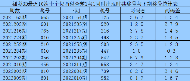 十个位合差分析:上期奖号十个位开出10组合,两码合为1,两码差为1,最近10次十个位两码合1与两码差1同时出现时,其奖号和下期奖号分别为: