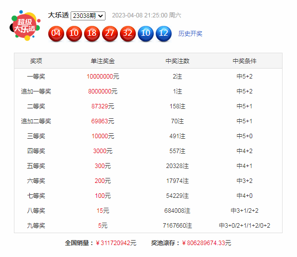 上期开奖:大乐透第2023038期开奖号码:04 10 18 27 32+10 12。其中前区号码012路比为2:2:1,奇偶比为1:4,大小比3:2。后区和值为22,跨度为2。