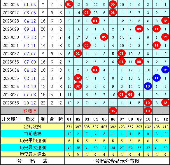 上期后区开出号码:10+12,2路号断档、全大组合、全偶组合。本期后区防2路号断档,两码看好06、10。
