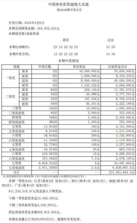 北京时间4月6日晚,体彩超级大乐透第24038期开奖,同时本期也是大乐透10亿大派奖的第9期。当期开奖号码为前区15 22 24 25 29,后区01 05。