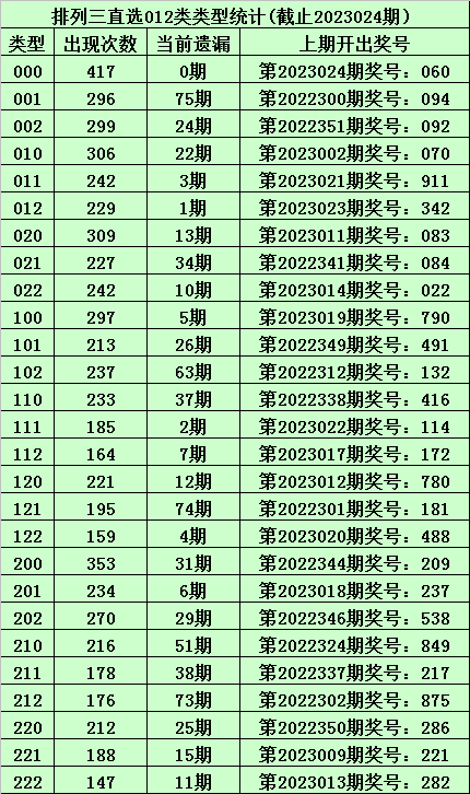 上期回顾:体彩排列三第2023024期开出奖号:060,其012路比为3:0:0,奖号012路类型为:000。