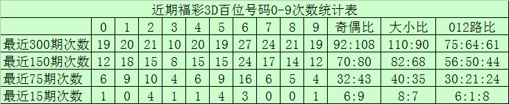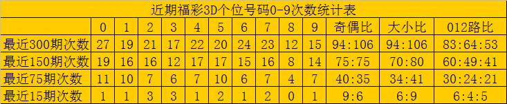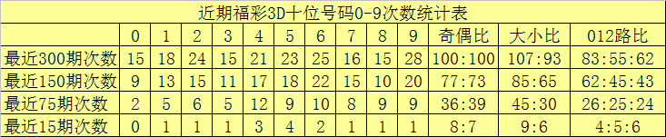 最近15期奖号由冷到热表现为:8→0次,0、1、4、6、9→1次,5、7→2次,2、3→3次,奖号奇偶比为9:6,大小比为6:9,012路比为6:4:5。