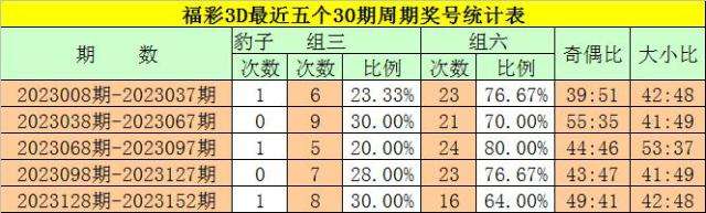在最近一个30期周期内(第2023128期-第2023157期),组三(含豹子)号码共出现9期,占开奖总数的36%,组六奖号共出现16期,开出比例为64%,上期出现组六号码之后,本期看好组六号码继续开出。