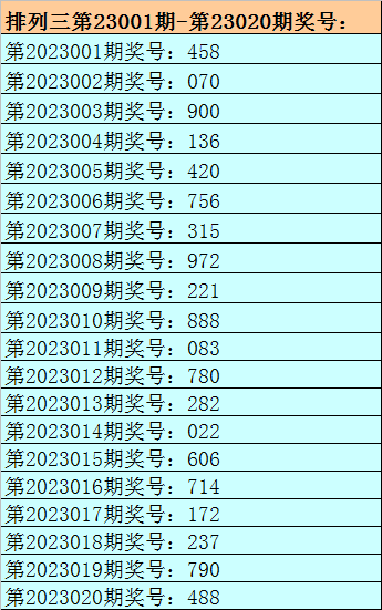 1。排列三最近十期分别开出号码:083-780-282-022-606-714-172-237-790-488,其中有8期奖号开出了上期的重复号码,本期预计第2023020期奖号:488中有重号,参考号码:8。