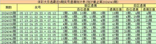 上期回顾:体彩大乐透第2024043期开出奖号为:03 04 08 14 27 + 05 07,其中前区各位奖号分别遗漏:3期、9期、0期、1期和8期,遗漏总值为21期,后区号码分别遗漏0期和5期,遗漏总值为5期。