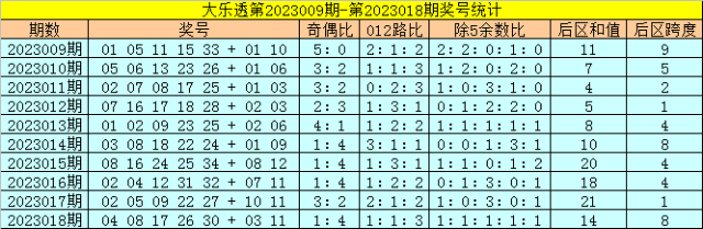 开奖回顾:体彩大乐透第23018期奖号开出:04 08 17 26 30+03 11,前区奖号和值为85,跨度为26,除5余数比为1:1:1:1:1,遗漏总值为25,后区奖号和值为14,跨度为8。
