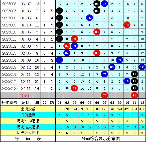 后区号码分析:后区上期奖号为03 11,在最近30期开奖中,后区各号码频次分别为:号码07出现8次,号码01、02、11出现7次,号码06出现6次,号码09、12出现5次,号码03、04出现4次,号码08出现3次,号码05、10出现2次。本期后区参考号码02 05 07 11 12,单挑两码07 11。
