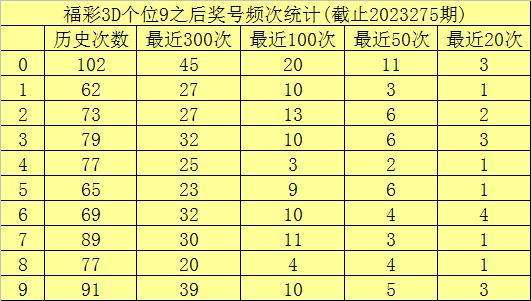 个位杀号:上期个位奖号为9,历史上个位奖号9共开出785次,最近100次个位奖号9出现时,其下期号码0-9开出次数分别为:奖号0开出20次,2开出13次,7开出11次,1、3、6、9开出10次,5开出9次,8开出4次,4开出3次。