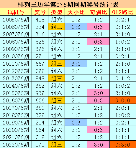 012路分析:历史上排列三第076期同期奖号中,012路奖号总个数比为19:18:17,012路奖号轮空期数比为6:5:6,今年第076期预计2路号码走冷轮空,看好012路比开出1:2:0。